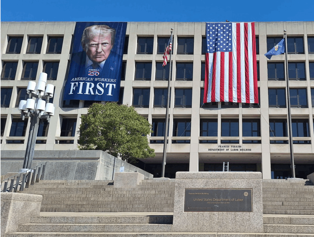 Trump’s “big, beautiful face on a banner in front of the Department of Labor.”